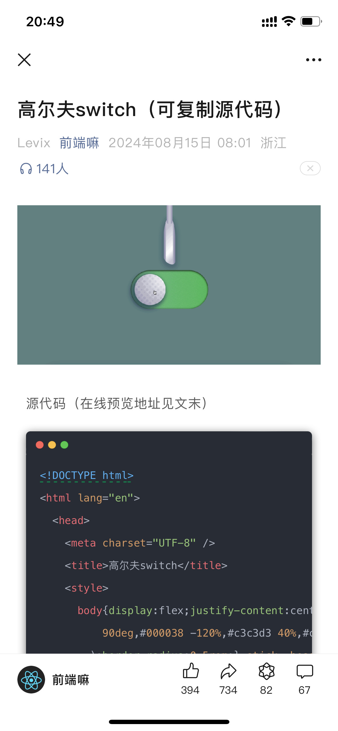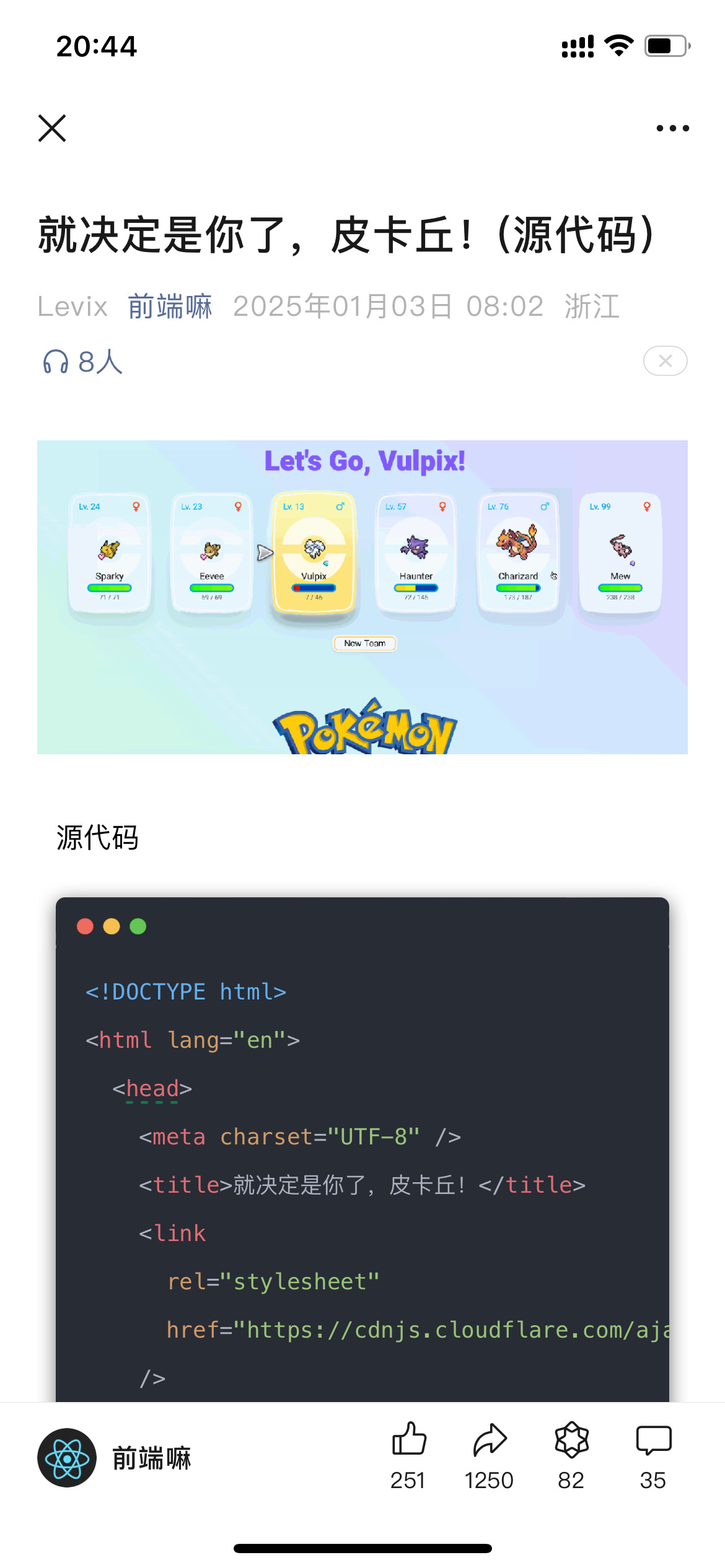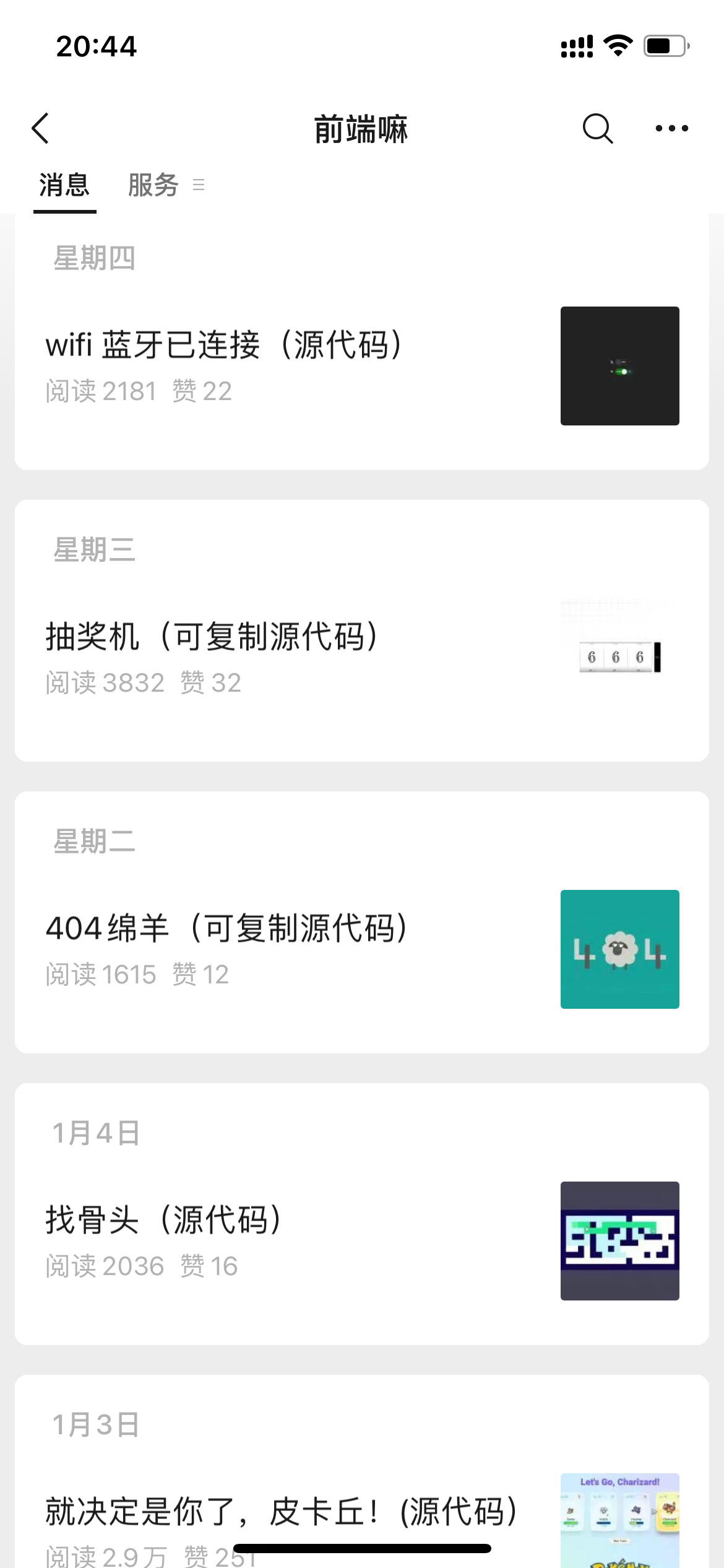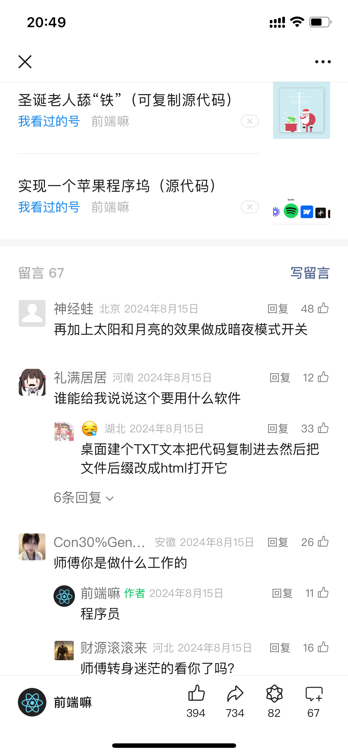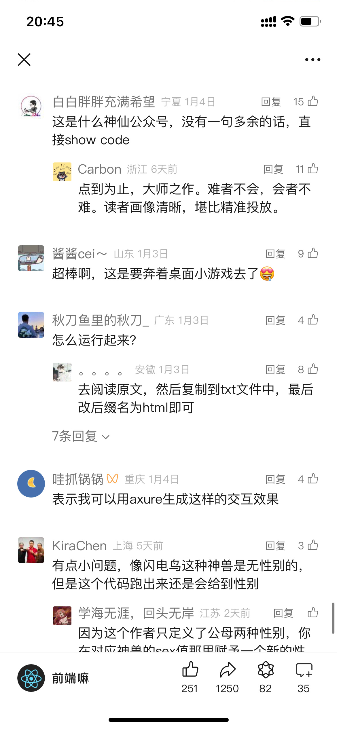 看到一个公众号,每天发布一个AI生成的HTML代码,已发布3...拿小多1/11/2025看到一个公众号,每天发布一个AI生成的HTML代码,已发布30篇原创,阅读量还有10万+的,吸引了不少小白读者,有点意思。 返回首页查看原文