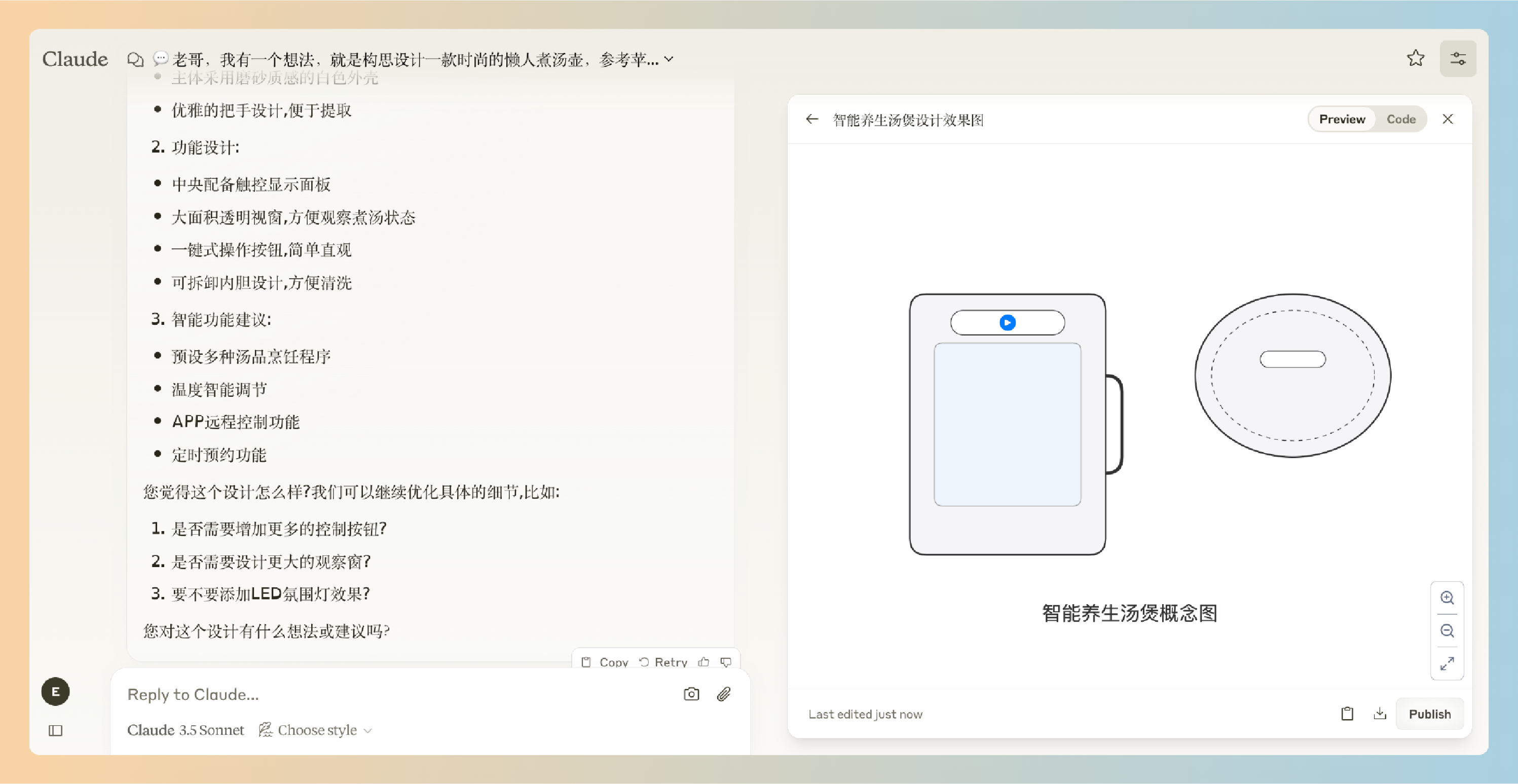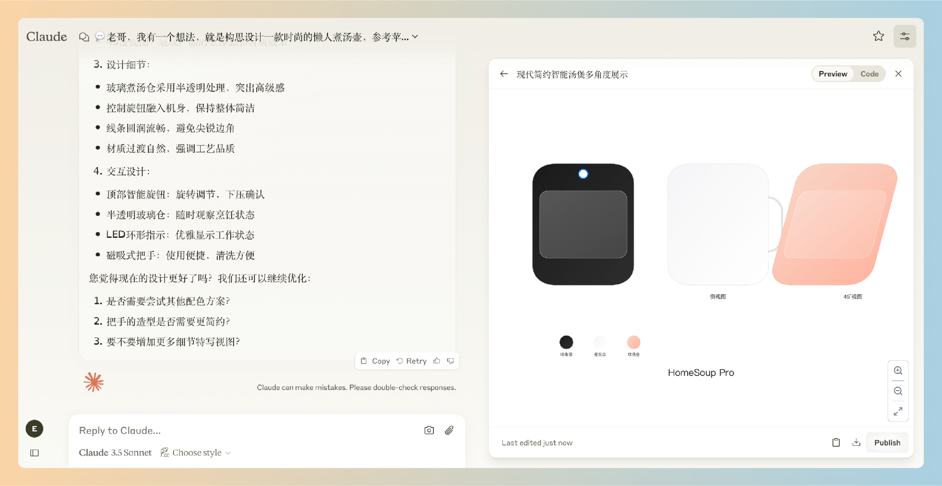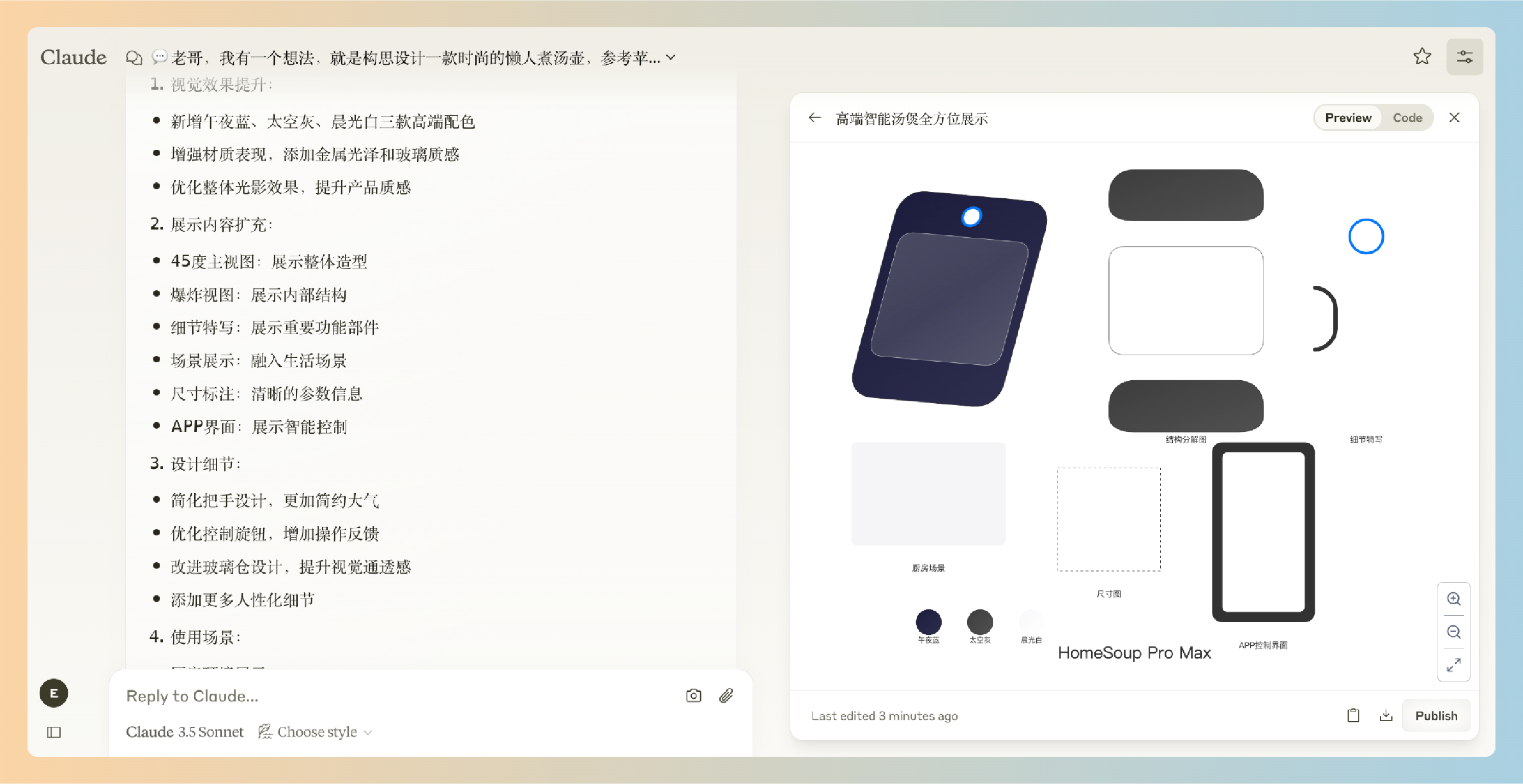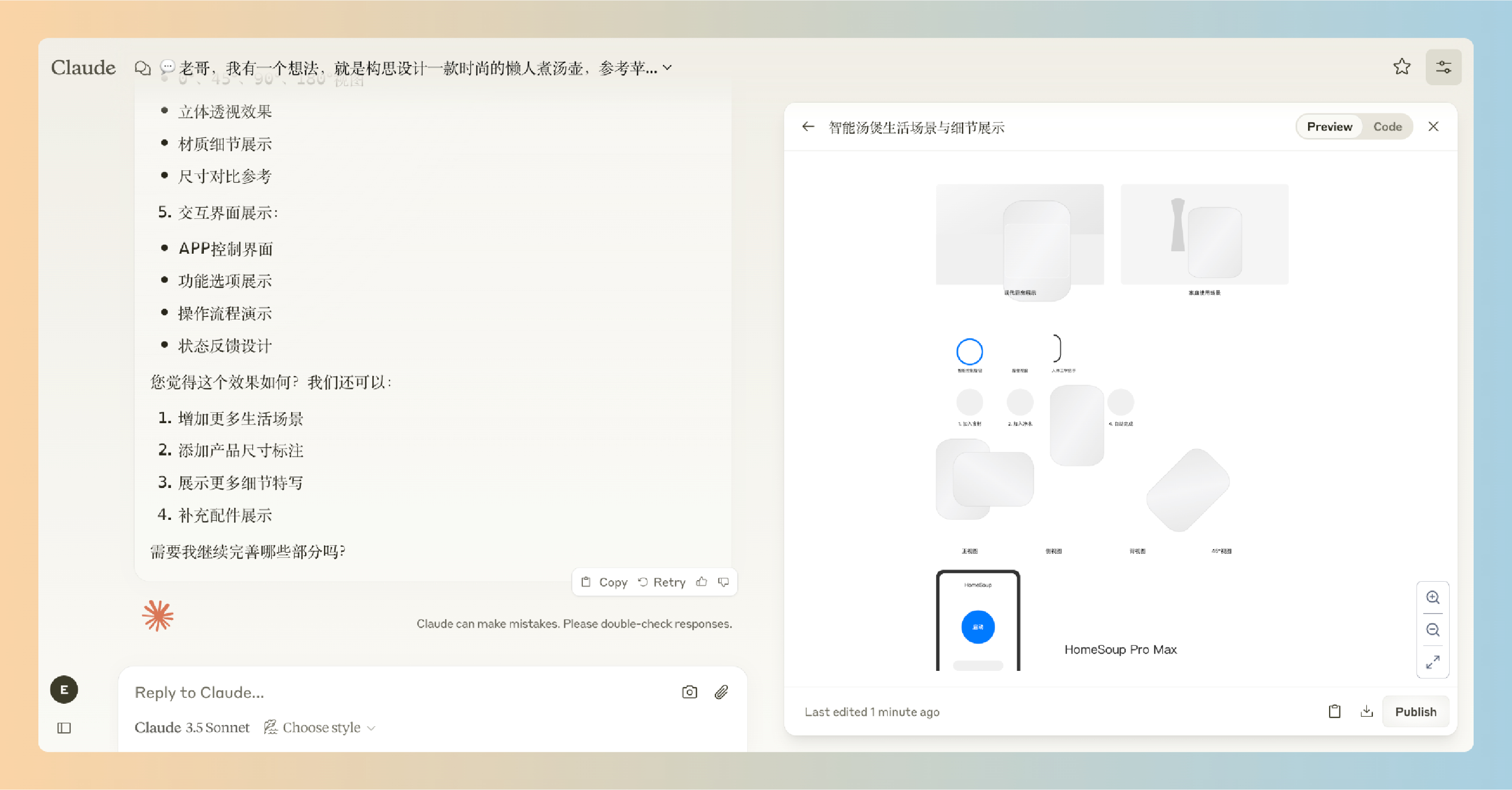 每当我有一些关于物理产品的想法时,我都会让Claude帮我基于我的想法构思一下,画一些效果图(不满意,再继续调整改进)展示出来,然后保存到我的笔记文档中。