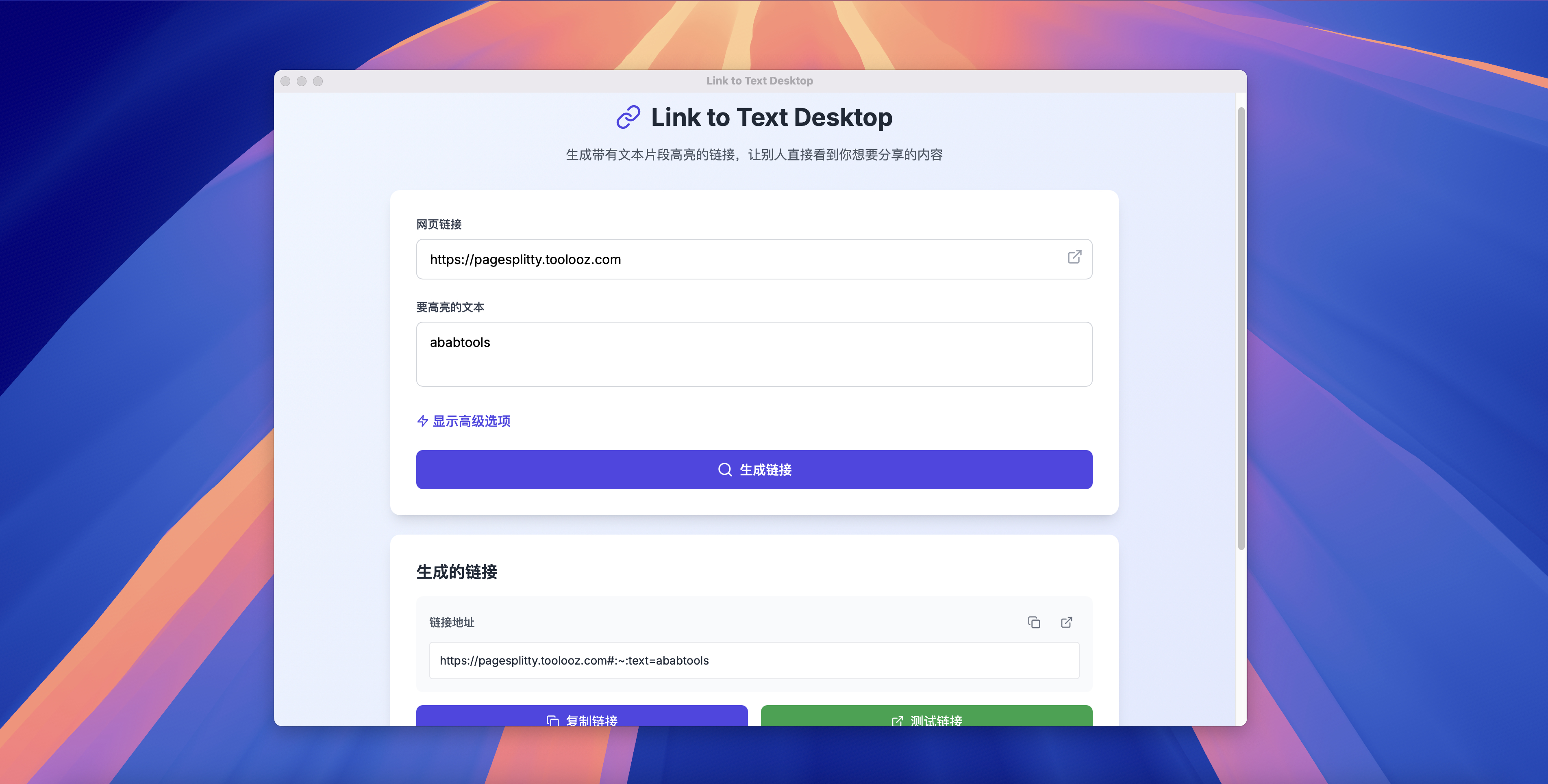 Link to Text 是一款桌面应用,可以帮助你生成带有 #:~:text= 文本片段的链接。这种链接在支持的浏览器中打开时,会自动滚动到指定文本并高亮显示。
