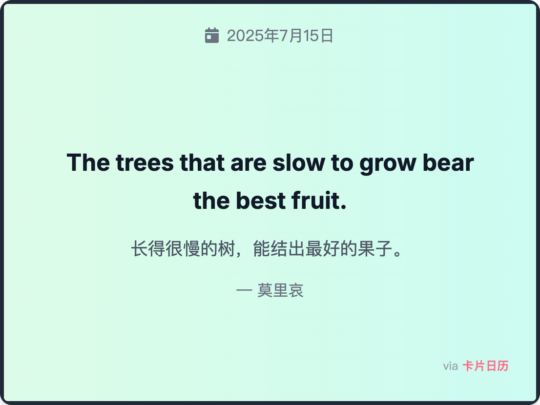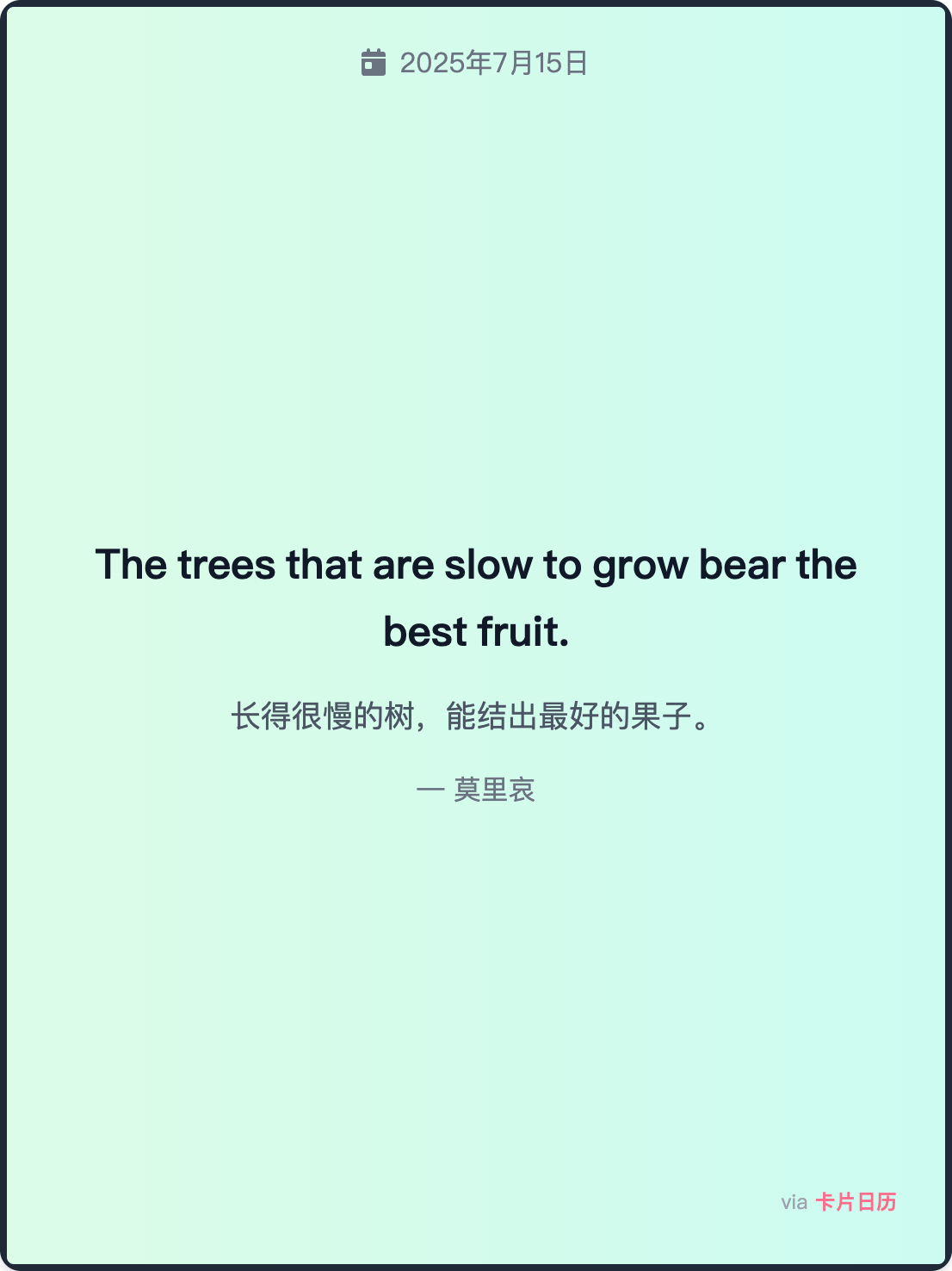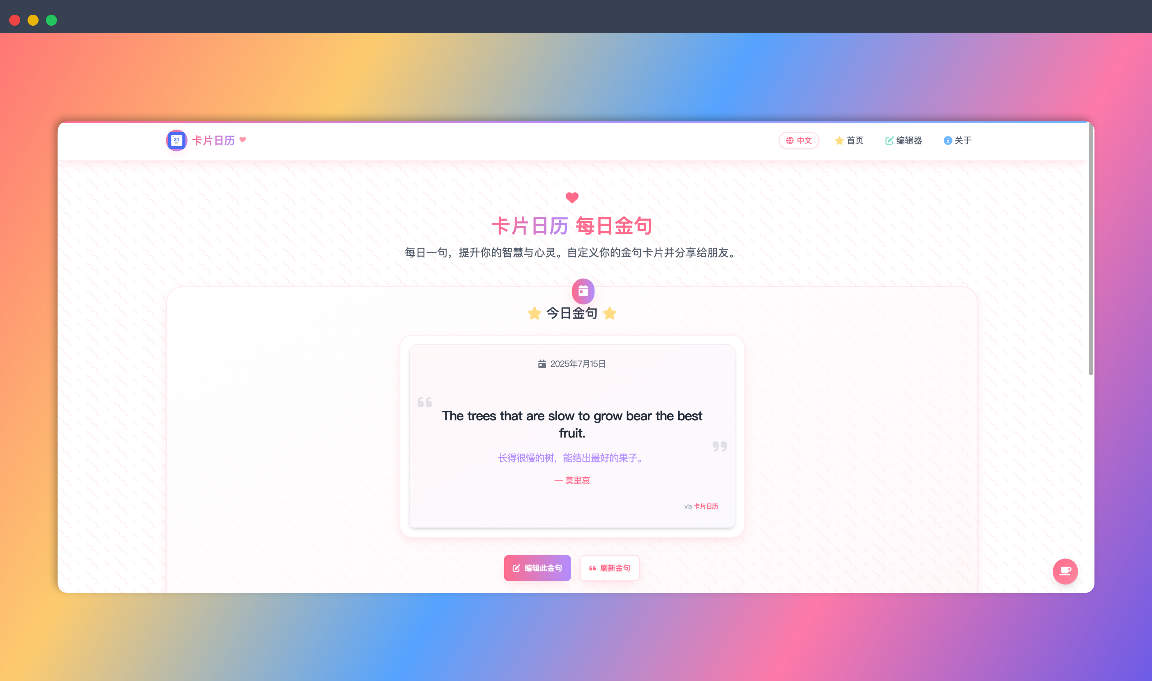 卡片日历:每日金句生成工具,创建精美的金句卡片,支持自定义内...拿小多7/15/2025卡片日历:每日金句生成工具,创建精美的金句卡片,支持自定义内容、样式和导出选项链接:cardcalendar.toolooz.com/zh 返回首页查看原文