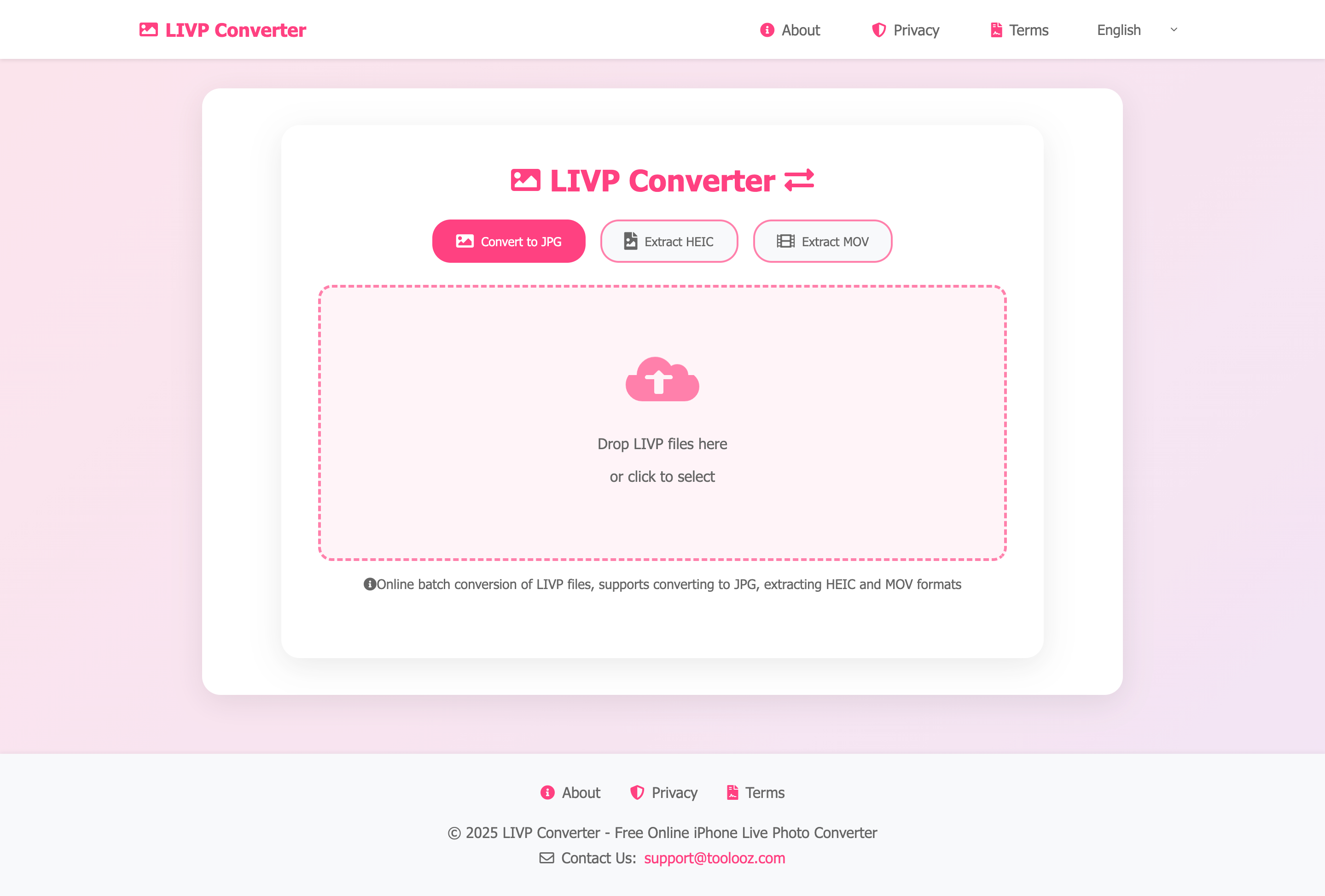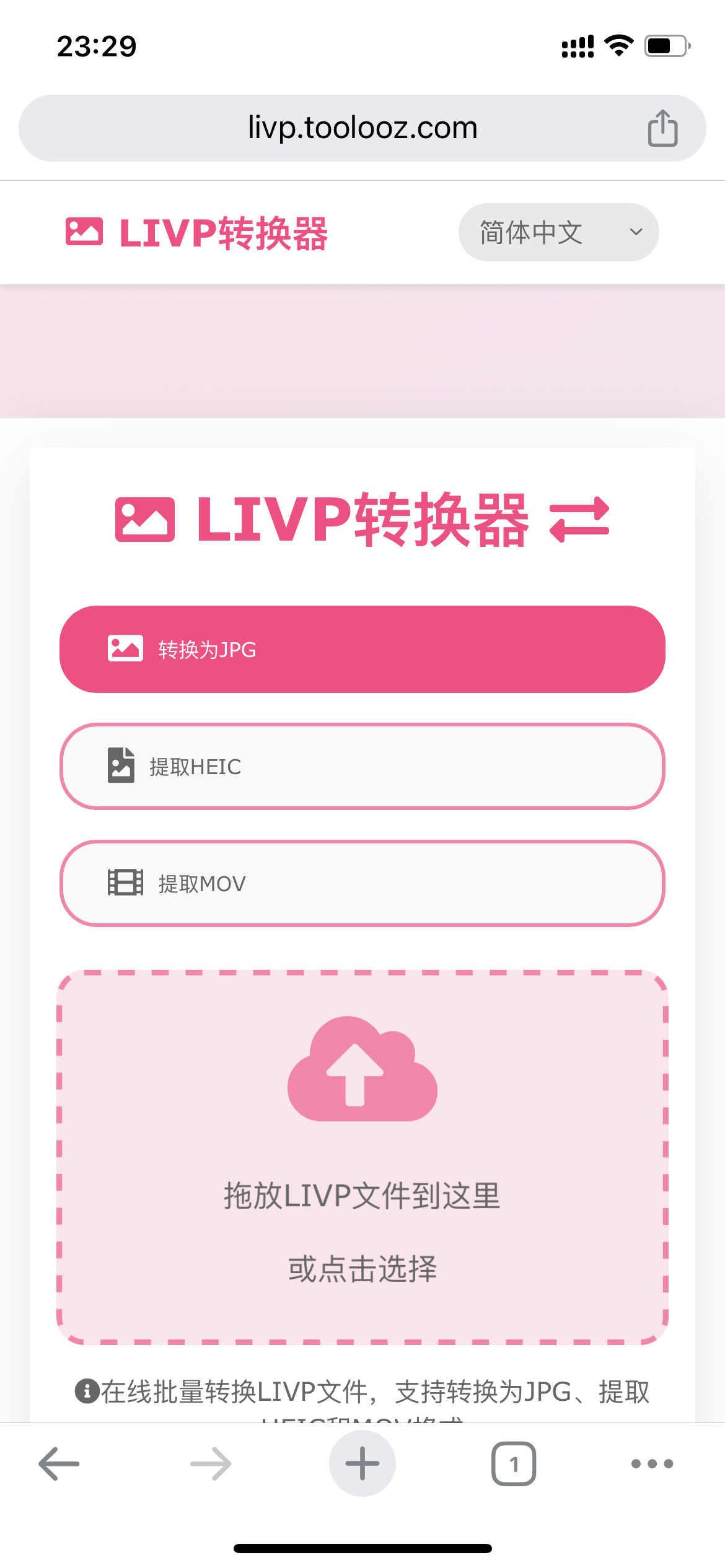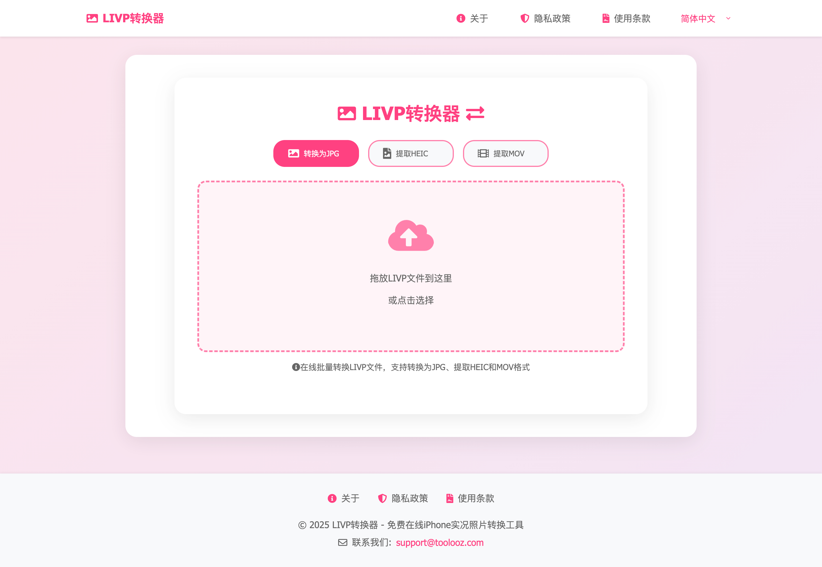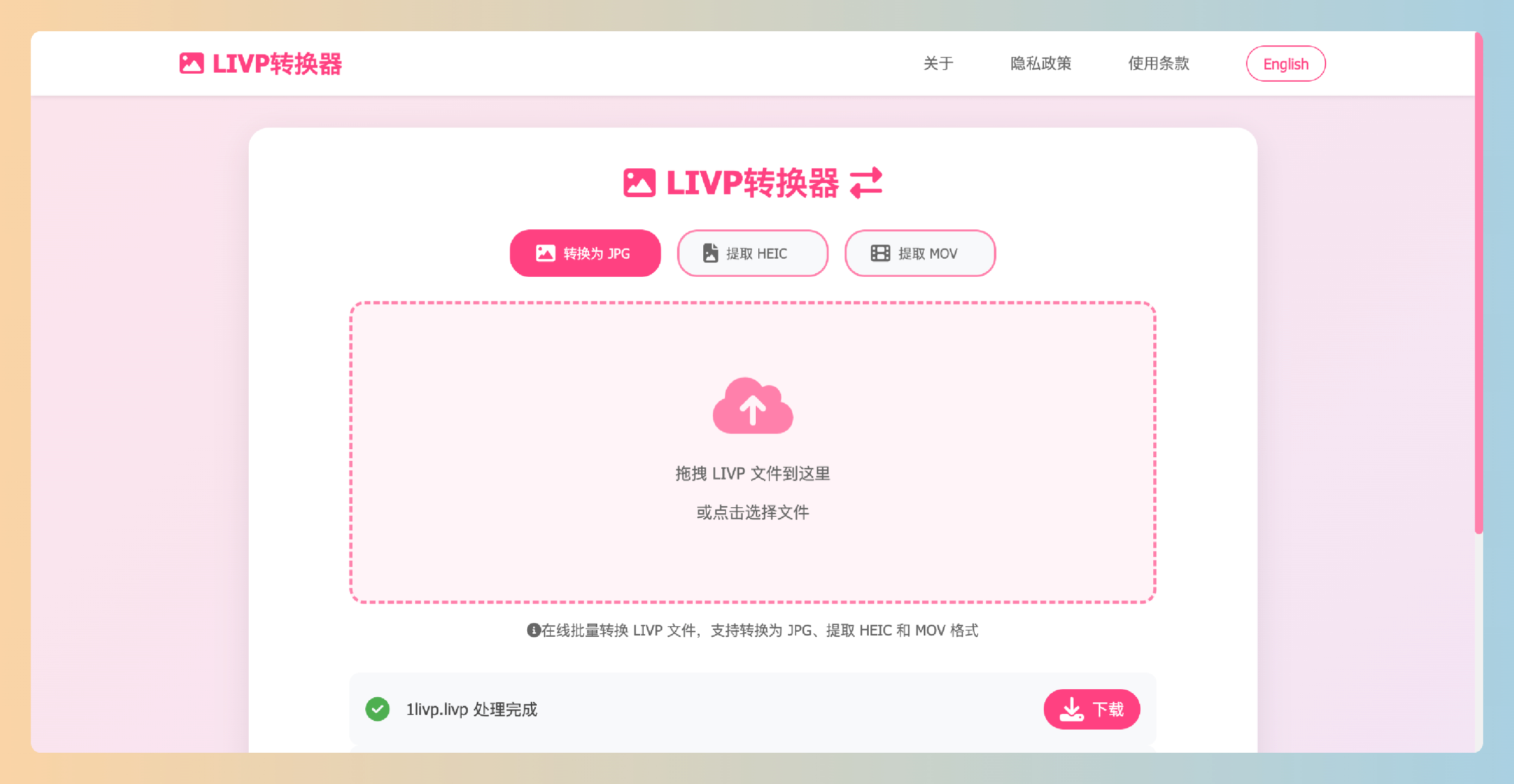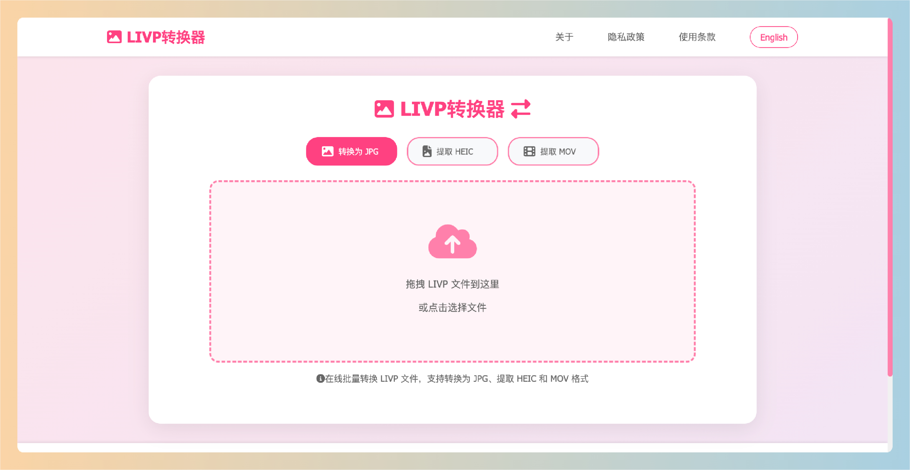 免费的在线iPhone实况照片转换工具,在线批量转换 LIVP 文件,支持转换为 JPG、提取 HEIC 和 MOV 格式,帮助用户轻松处理LIVP文件。