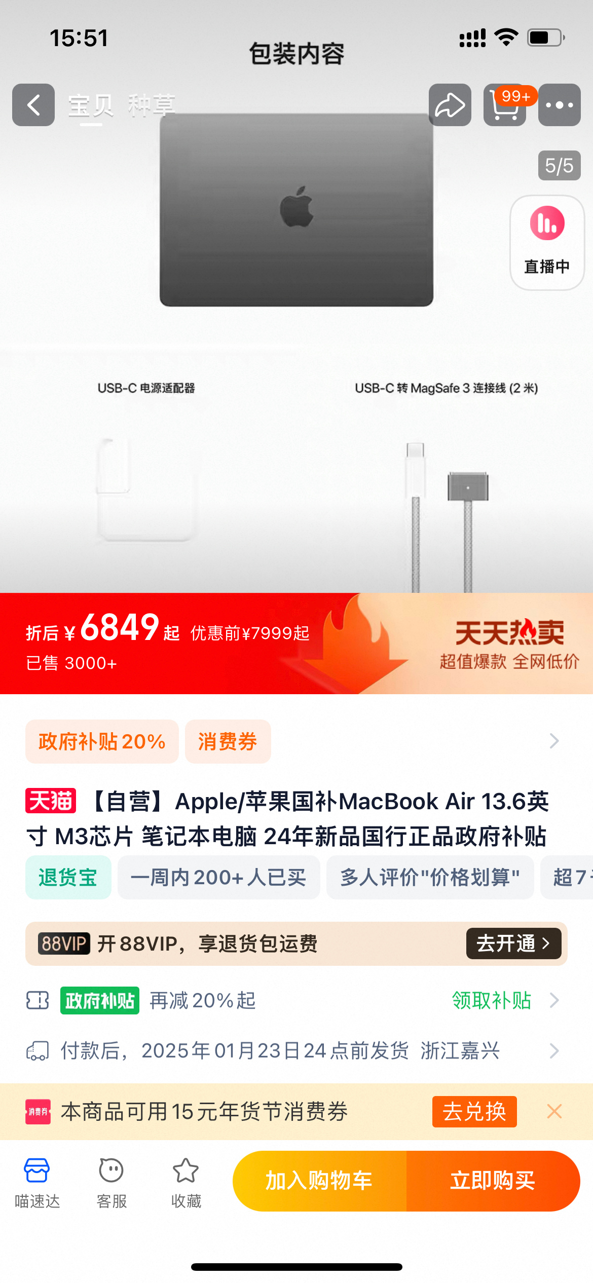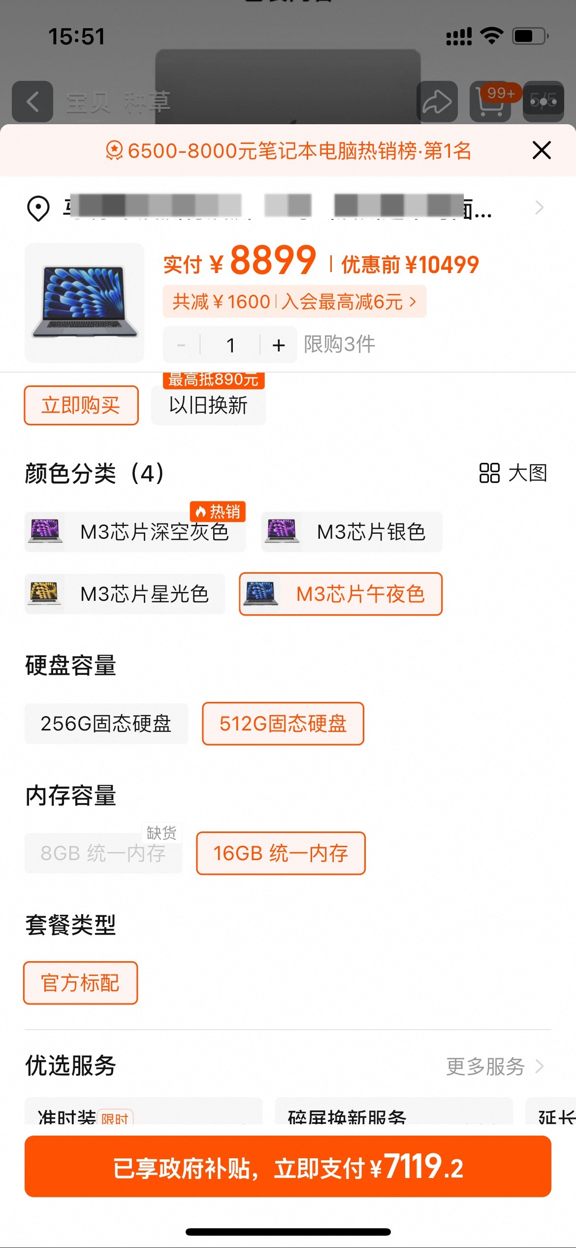 阿里官方自营喵速达,国补后,7119块就可以买个Macbook air M3 12g内存+512g硬盘。