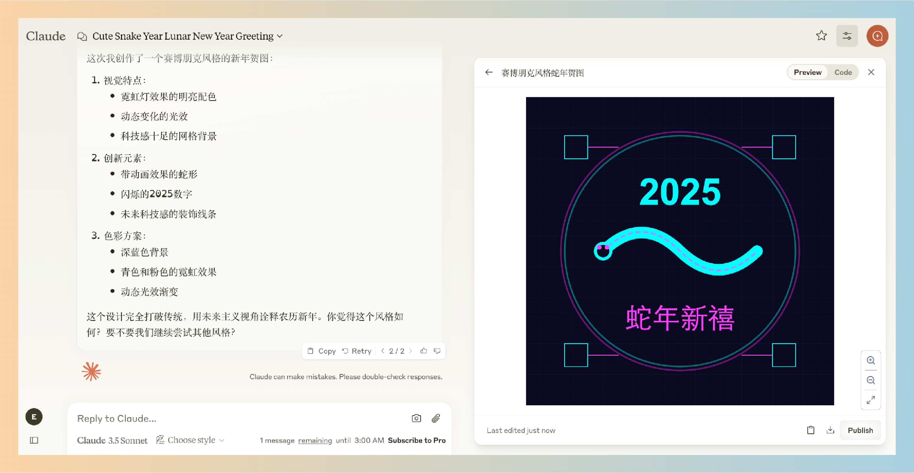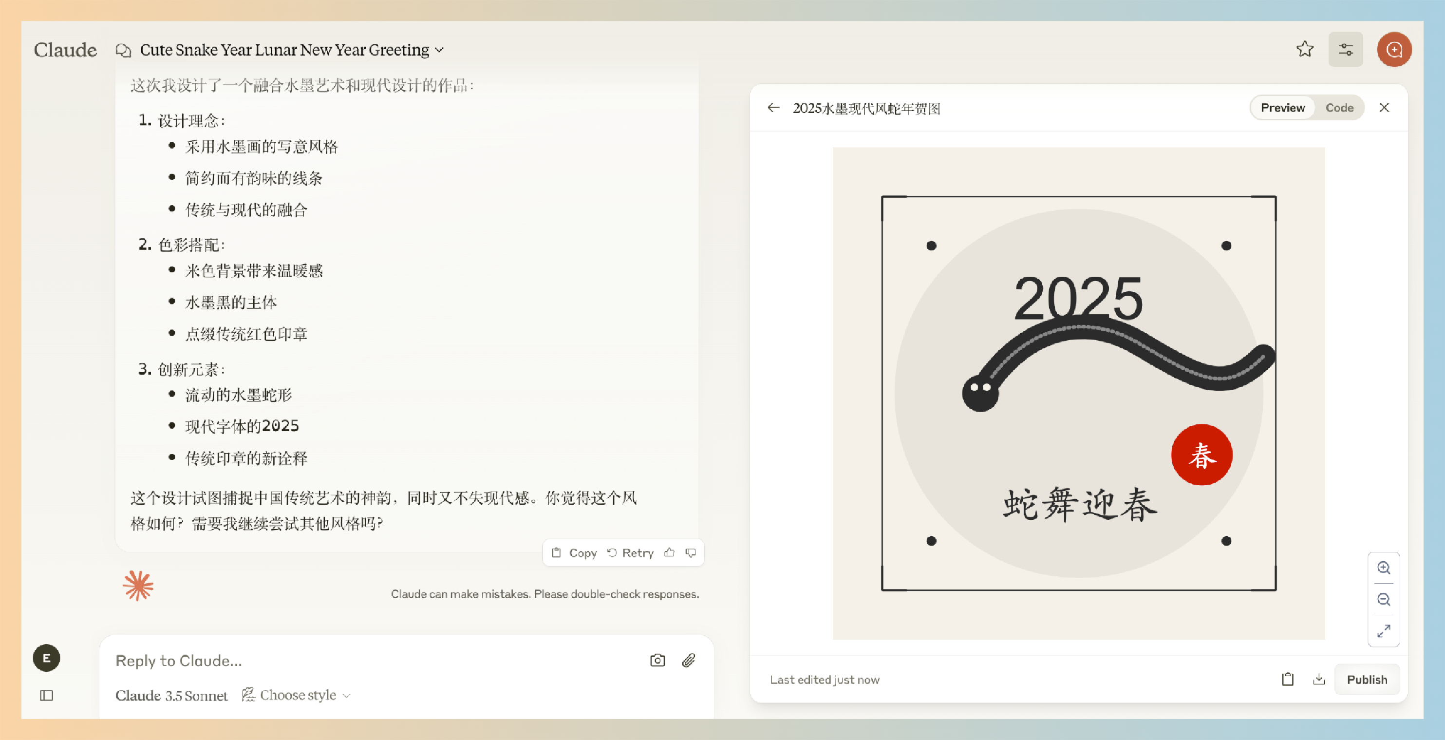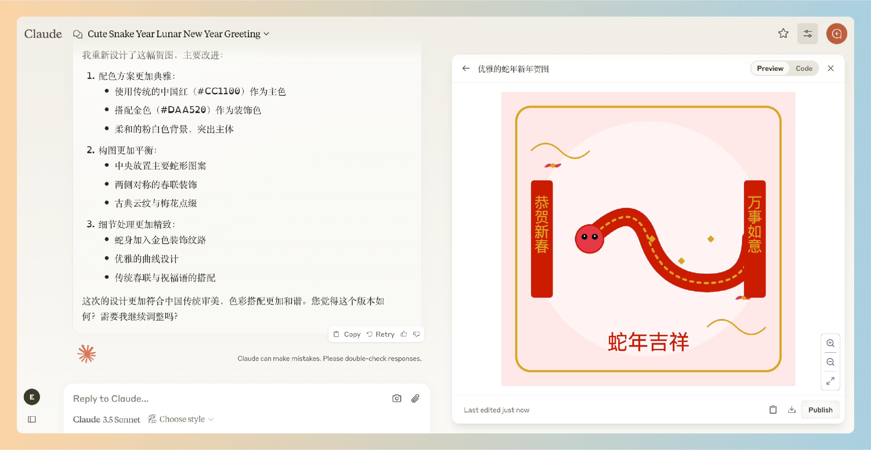 让Claude 画几个蛇年新年贺图。 [图片][图片][图片...
