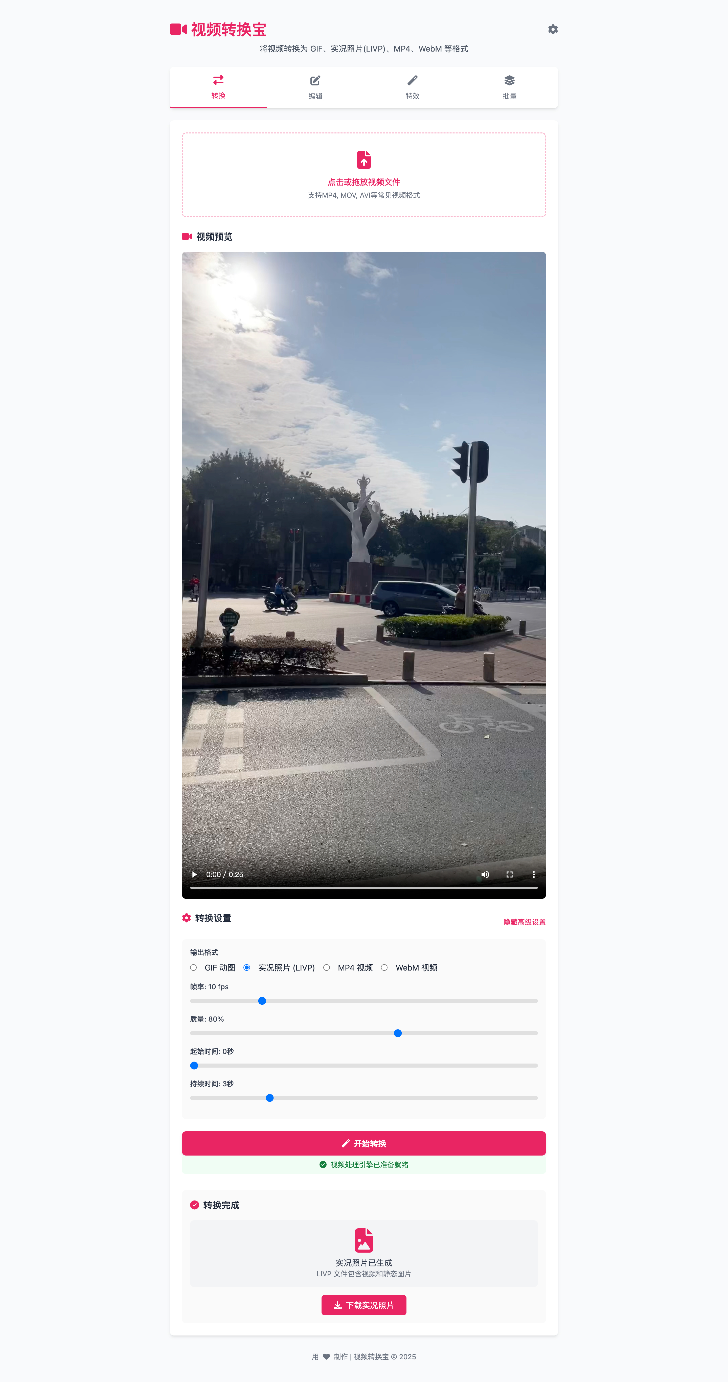 做了后,才发现Web环境中是无法复制iOS原生Live Ph...拿小多3/2/2025做了后,才发现Web环境中是无法复制iOS原生Live Photo格式的,因为无法直接操作特定的元数据格式,也没有办法创建包含正确元数据轨道的视频文件和单一的HEIC容器文件。网页链接,这个实现方案原理还是适合做成APP。 查看图片 - 转发 @拿小多: 正在构建一个小而精的视频转换器——视频转换宝,目前已经实现将视频转换为 GIF、实况照片(LIVP)、MP4、WebM 等格式。后面,编辑、特效、批量处理,逐个加入进来,今天周末休息休息,不工作了。 返回首页查看原文