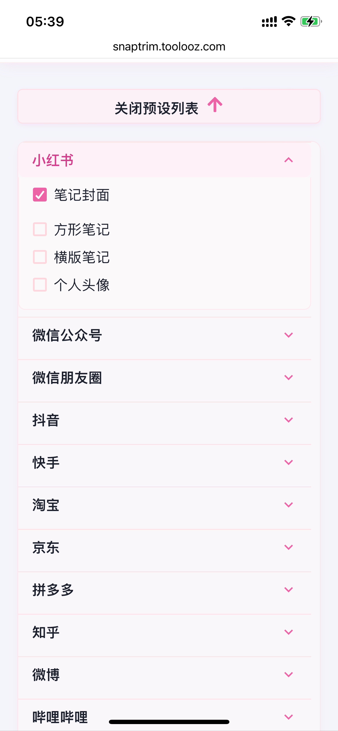 ~内置平台尺寸:图裁刀预设了各大社交媒体的标准图片尺寸,用户无需手动输入或查询,点一下即可适配。